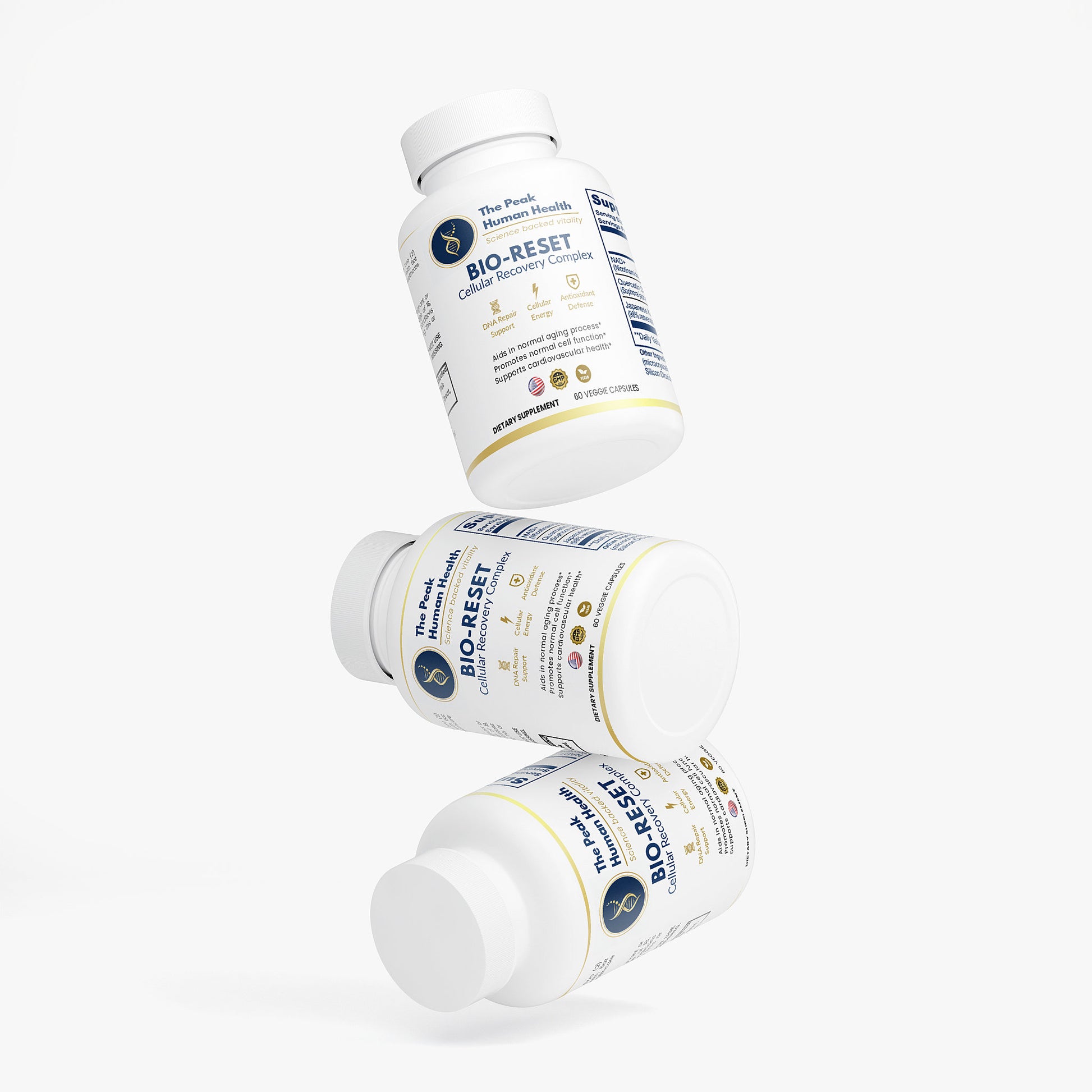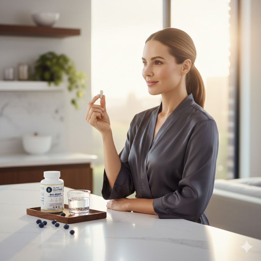 A diferencia de las cápsulas genéricas, BIO-RESET utiliza una fórmula de grado clínico que combina 500mg de NAD+ puro con Quercetina y Resveratrol. Estos actúan como "activadores" que aseguran que el NAD+ realmente entre en tus células y no se desperdicie durante la digestión.